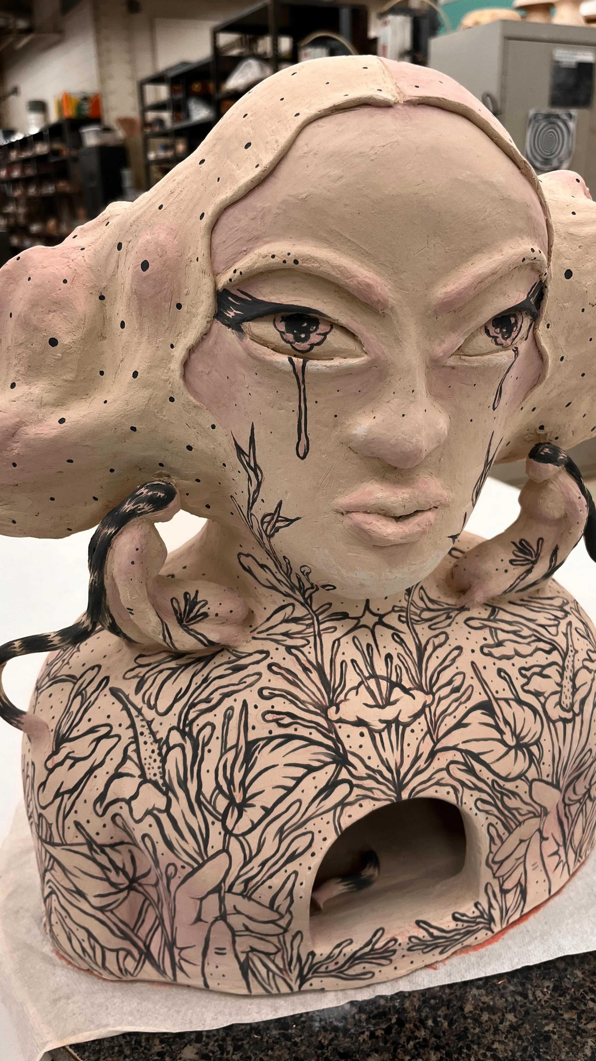 An experimental, interactive woodcut sculpture that explores the idea of Safe Spaces. By translating my illustrative voice into the medium of wood, I wanted to create something that has a point of view, is interactive and meaningful. I was thinking about comfort and nesting and how we go within to find comfort in the different versions of ourselves. I chose a set of three nested figures with distinctive body language to represent the three versions of self -the protective, the hermit; the sassy free inner-self.