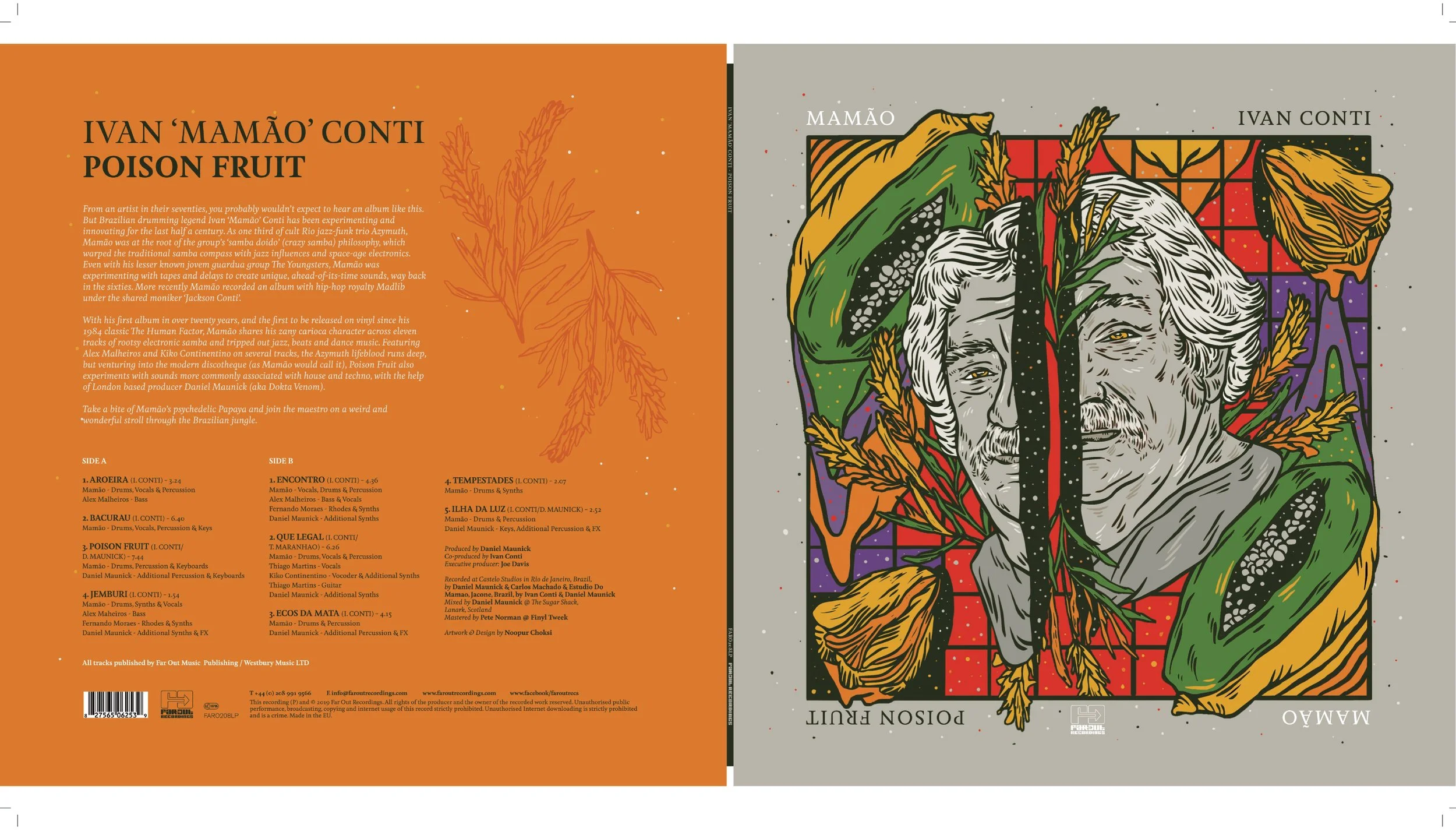 With his first album in over twenty years, and the first to be released on vinyl since his 1984 classic The Human Factor, Mamão shares his zany carioca character across eleven tracks of rootsy electronic samba and tripped out jazz, beats and dance music. Featuring Alex Malheiros and Kiko Continentino on a number of tracks, the Azymuth lifeblood runs deep, but venturing into the modern discotheque (as Mamão would call it), Poison Fruit also experiments with sounds more commonly associated with house and techno, with the help of London based producer Daniel Maunick (aka Dokta Venom) and Mamão's son Thiago Maranhão.